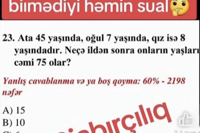 News365.az xəbər verir ki, iki mindən çox müəllim aşağıda təqdim edilən adi məktəbli sualına belə cavab verə bilməyib.