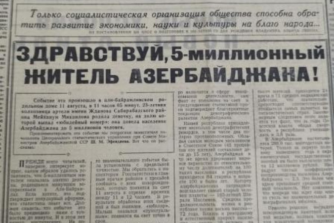 Yeri gəlmişkən, arxivdəki qəzetləri vərəqləyərkən qarşıma bəzi maraqlı məlumatlar da çıxdı. Məsələn, 1920-ci ilin sonunda Azərbaycanın əhalisi 1 milyon 952 min, 1939-cu ilin yanvarında 3 milyon 205 min, 1959-cu ilin eyni ayında isə 3 milyon 698 min nəfər olub. Başqa maraqlı fakt: 1968-ci ildə Azərbaycan SSRİ-də "ən gənc xalq" imiş. Əhalinin 45 faizini 15 yaşınadək uşaqlar təşkil edirmiş. Və yaxud, qəzetlərin yazdığına görə, Azərbaycan uzunömürlülərin nisbi sayına görə dünyada birinci imiş. Yəni hər 100 min əhaliyə yaşı 100-dən çox olan 84 nəfər düşürmüş.