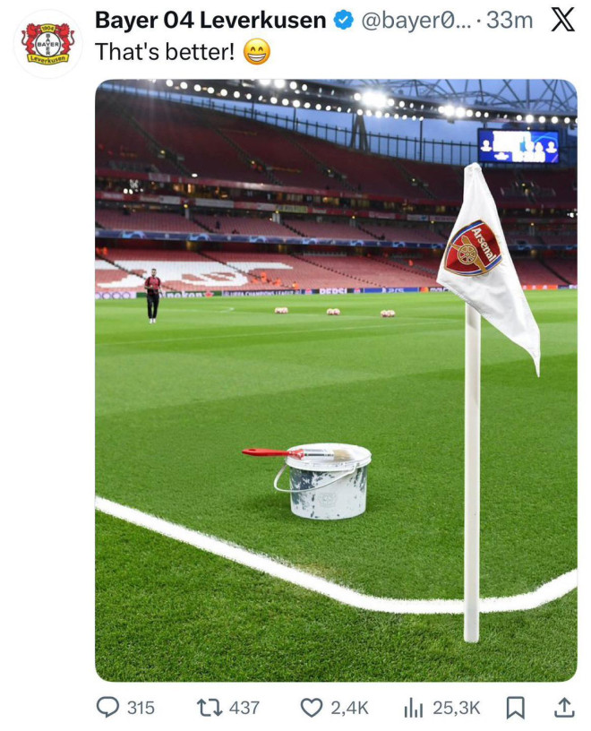 Belə ki, bu il özünəməxsus taktikası ilə küncdən zərbələrdən dəfələrlə fərqlənən Arsenal almanların yumor hədəfinə çevrilib. Leverkusen klubu küncdən zərbə bayrağının əvəzinə uzərində arsenalın loqosu olan bayraq şəkli paylaşaraq rəqiblərinə sataşıblar.