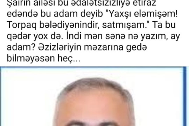 “Şairin ailəsi bu ədalətsizizliyə etiraz edəndə bələdiyyə sədri deyib "Yaxşı eləmişəm! Torpaq bələdiyənindir, satmışam”,- deyə paylaşımda qeyd edilib.