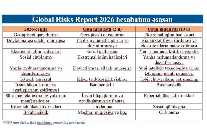 Dünya liderləri cəmisi 5 gün sonra Davos səfərinə hazırlaşdığı ərəfədə Dünya İqtisadi Forumu Qlobal Risk 2026 hesabatını açıqladı. Hesabat 2026, yaxın 2 və uzunmüddətli 10 ili əhatə edən riskləri əks etdirir. Hesabata əsasən, yaxın 10 il dünya üçün kifayət qədər fırtınalı və gərgin keçəcək. Yaxın iki il ərzində geosiyasi qarşıdurmaların davam etməsi və bunun təsiri ilə dövlətlər arasında silahlı qarşıdurmalar dünya üçün əsas risk olaraq qalacaq. Eyni zamanda dezinformasiya da artıq qlobal risk kimi gündəmdədir. Yalnız 2 ildən sonra geosiyasi gərginliklərin səngiməsi ilə dünyanın gələcəyi üçün əhəmiyyətli olan qlobal iqlim dəyişikliyi və ekoloji problemlər ön plana çıxacaq.