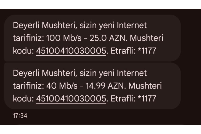 Məsələ ilə bağlı istifadəçi şirkətin texniki şöbəsi ilə əlaqə saxladığını bildirib. Onun sözlərinə görə, müraciətdən sonra aylıq ödəniş yenidən 15 manata endirilsə də, bu dəfə internet sürəti 40 Mbit/s olaraq dəyişdirilib.