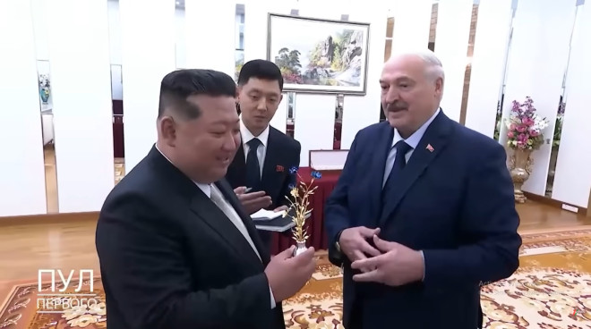 News365.az xəbər verir ki, görüşün ən diqqətçəkən məqamı hədiyyə mübadiləsi zamanı yaşanıb. Aleksandr Lukaşenko Kim Çen Una Belarus istehsalı olan VSK avtomatı, məşhur Slutsk kəməri, şokoladlar və araq hədiyyə edib.