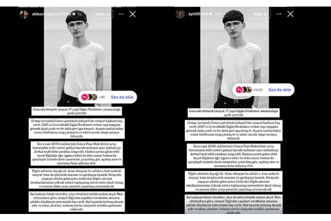 Belə ki, bir sıra müğənni və bloqerlər instaqram hesablarının hekayə bölümündə Elgünün qətli ilə bağlı paylaşım edərək gənc oğlanın cinayətin qurbanı olmasına səssiz qalmayıblar.