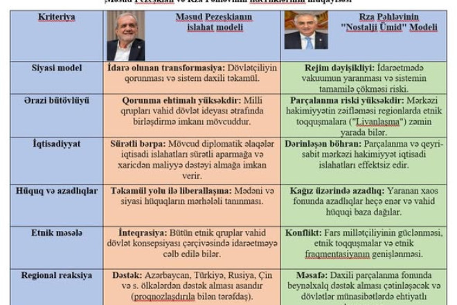 Məsud Pezeşkianla paralel olaraq, devrilmiş Pəhləvilərin təmsilçisi Rza Pəhləvi də yaranmış situasiyadan istifadə edərək proseslərə müdaxilə etməyə çalışır. İndi İran cəmiyyəti özü qərar verməlidir potensial islahatlar təklif edən Məsud Pezeşkianımı, yoxsa nostalji ümid təklif edən Rza Pəhləvinimi dəstəkləyəcək? Hər iki siyasi fiqurun müqayisəli təhlilini apardıqda kimin daha effektiv ola bilmə ehtimalı ortaya çıxır.