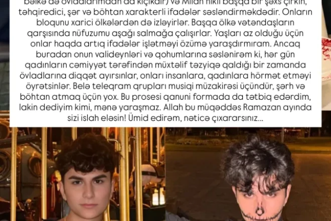 “Uzun müddətdir fəaliyyət göstərən “Songfestival Azerbaijan” səhifəsinin teleqram qrupunda haqqımda Teymur İbrahimov adlı bu şəxs (hansı ki, bəlkə də övladlarımdan da kiçikdir) və Milan nikli başqa bir şəxs çirkin, təhqiredici, şər və böhtan xarakterli ifadələr səsləndirməkdədir. Onların bloqunu xarici ölkələrdən də izləyirlər. Başqa ölkə vətəndaşların qarşısında nüfuzumu aşağı salmağa çalışırlar. Yaşları az olduğu üçün onlar haqda artıq ifadələr işlətməyi özümə yaraşdırmıram. Ancaq buradan onun valideynləri və qohumlarına səslənirəm ki, hər gün qadınların cəmiyyət tərəfindən müxtəlif təzyiqlərə məruz qaldığı bir zamanda övladlarına diqqət ayırsınlar, onlara insanlara, qadınlara hörmət etməyi öyrətsinlər. Belə Teleqram qrupları musiqi müzakirəsi üçündür, şərh və böhtan atmaq üçün yox. Bu prosesi qanuni formada da tətbiq edərdim, lakin dediyim kimi, mənə yaraşmaz. Allah bu müqəddəs Ramazan ayında sizi islah eləsin! Ümid edirəm, nəticə çıxararsınız”.