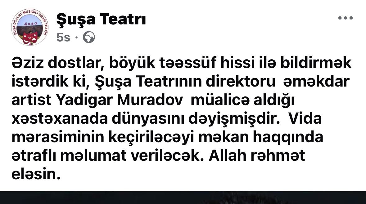 Şuşa Dövlət Musiqili Dram Teatrının direktoru Əməkdar artist Yadigar Muradov vəfat edib.